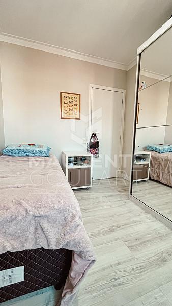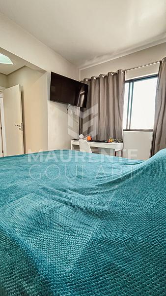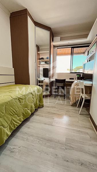 Os dois quartos de solteiro também foram projetados para oferecer o máximo de conforto e conveniência, com móveis planejados e um deles equipado com ar condicionado, garantindo uma temperatura agradável durante todo o ano. A suíte principal é o seu refúgio particular, com um armário planejado que oferece muito espaço de armazenamento e também conta com ar condicionado para garantir suas noites de sono tranquilas.