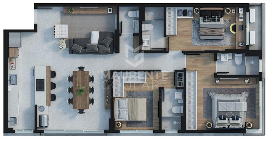 São 3 dormitórios, todos suítes, projetados para proporcionar conforto e privacidade a cada membro da família. Cada ambiente foi cuidadosamente planejado, com banheiros ventilados naturalmente, persianas motorizadas e acabamento em alto padrão. O piso vinílico nas áreas íntimas traz o aconchego que transforma o descanso em um verdadeiro prazer, enquanto o porcelanato nas áreas sociais reflete elegância e praticidade.