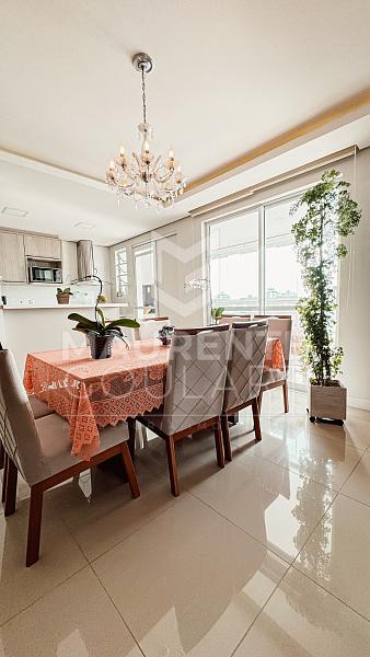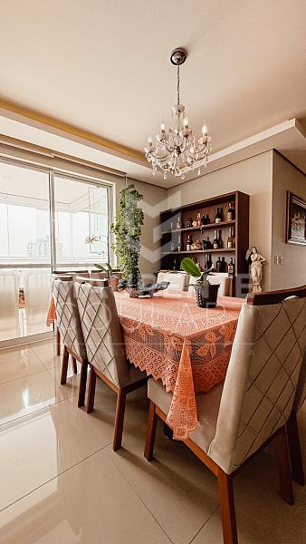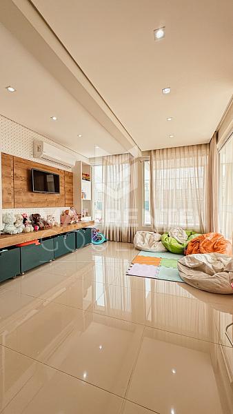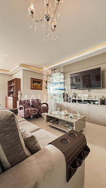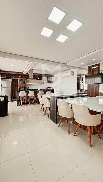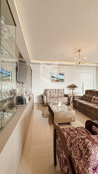 A decoração elegante, com piso em porcelanato brilhosos cuidadosamente selecionados, convida a explorar cada detalhe deste lugar especial. À direita, uma sala espaçosa e bem distribuída, com móveis planejados e ambientes integrados, oferece o cenário perfeito para momentos de relaxamento e encontros com amigos e familiares.