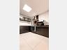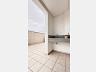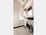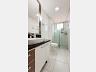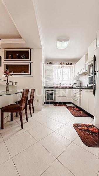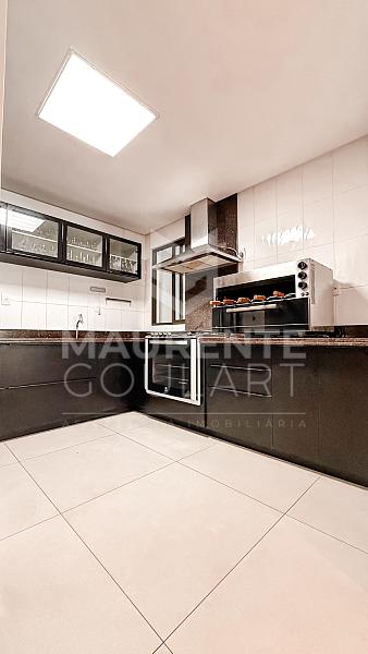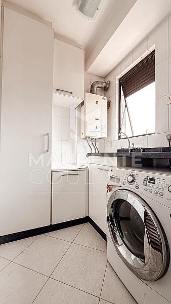 A cozinha conta com móveis planejados e se conecta de forma inteligente ao ambiente social, enquanto a área de serviço é separada, trazendo mais organização e praticidade.