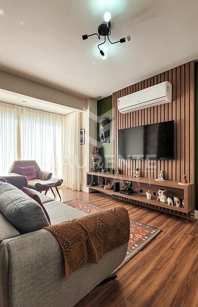 Ao cruzar a porta, você é recebido por uma sala ampla perfeita em  dois ambientes, com piso laminado que acrescenta um toque de conforto e modernidade. A sala se abre para um incrível terraço garden – o espaço ideal para relaxar ao ar livre ou receber amigos em um ambiente aconchegante. Um lindo painel ripado na sala traz sofisticação e estilo ao espaço, tornando-o ainda mais acolhedor.