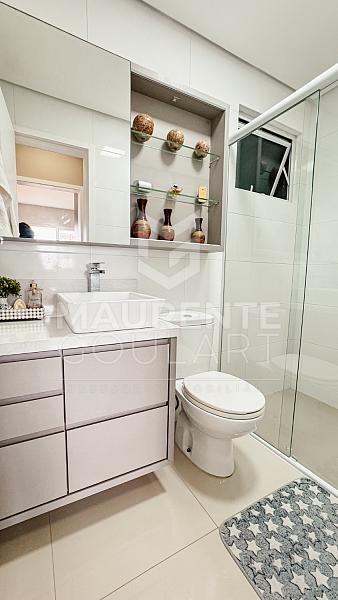 Na área íntima, o projeto foi pensado para oferecer conforto absoluto: são 3 dormitórios, sendo 2 suítes, todos com móveis planejados sob medida, acabamento em gesso e piso laminado, garantindo aconchego térmico e elegância. O banheiro social complementa o layout com praticidade, enquanto a área de serviço separada mantém a organização e a funcionalidade do imóvel.