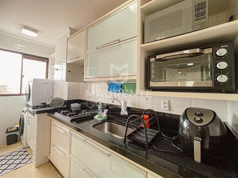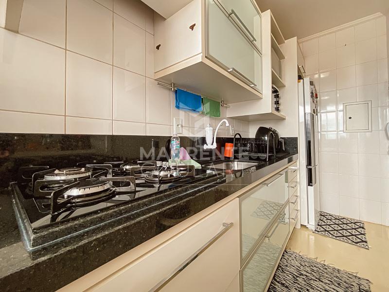 A sala é ampla e iluminada, integrada à sacada com vista livre, onde o sol entra com suavidade e o ar circula com tranquilidade — o lugar perfeito para começar o dia com um café ou encerrar a noite admirando o pôr do sol. A cozinha, prática e bem distribuída, foi pensada para quem valoriza funcionalidade no dia a dia.