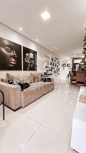 Voltando ao corredor principal, você será atraído pela sala de estar e jantar integradas. Este é o coração do apartamento, um espaço perfeito para receber amigos e familiares. A decoração impecável, o piso de porcelanato e o teto rebaixado em gesso criam uma atmosfera acolhedora e sofisticada.