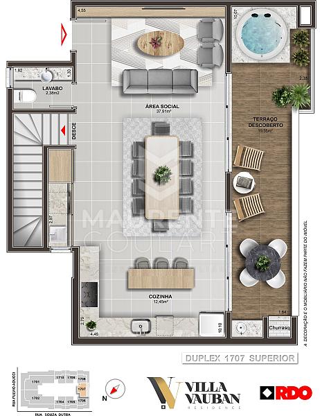 No pavimento inferior, a área social possui uma sala ampla para 2 ambientes, com ótima entrada de luz natural e integração entre os espaços. A área de serviço é separada, mantendo a organização do dia a dia. No piso superior, 1 sala de estar íntima complementa o ambiente com um espaço reservado para relaxar.